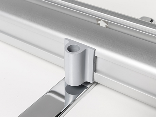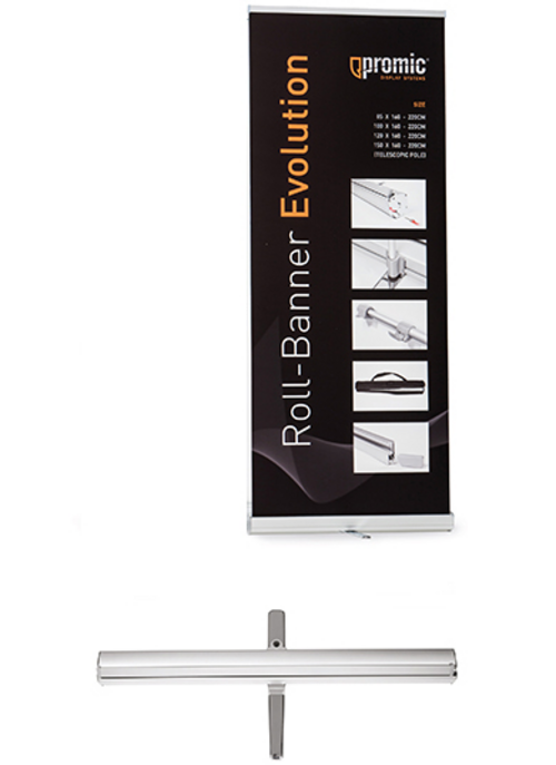 Das Roll Up Evolution hat eine sehr robuste Kassette aus Aluminium und verchromtem Stahl. Durch den externen Stangenhalter wird eine hohe Standfestigkeit und Gradlinigkeit des Bannersystems erreicht. Eine Teleskopstange mit "Easy-Clip System" ermöglicht einen einfachen Aufbau mit einer variablen Höhe zwischen 175 und 215 cm. Die Breite beträgt 85  cm. Das Evolution wird mit blickdichter Folie bestückt und in einer verstärkten Tasche mit Innenfutter ausgeliefert. Beachten Sie bitte die Dateivorgaben